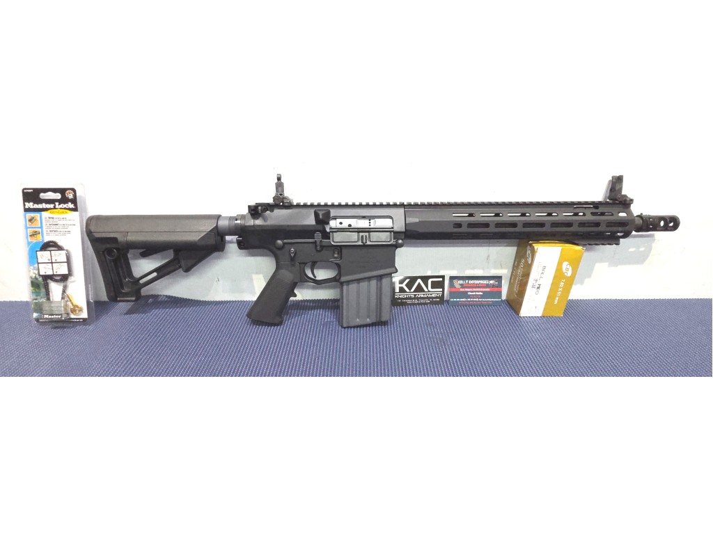 Knight's Armament SR25K5 #121483 14.5" .308/7.62 non-dimpled 4150 5R Chrome lined barrel with 13" URX6 handguard and open brake Upper, and KAC SR25 308 Ambi Lower Sporting a Magpul SLS Stock and one 20rd mag.